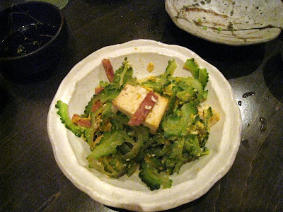 Goya, una epècie de cogombre amb un gust un xic amarg, amb tofu, pernil i ous remenats: